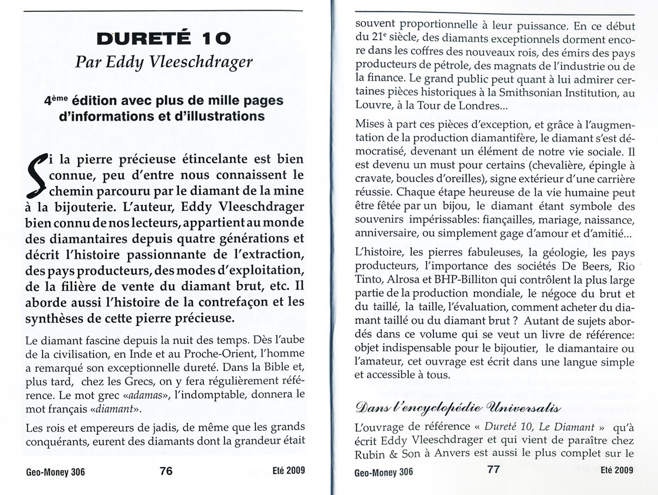 L’ouvrage de référence "Dureté 10, Le Diamant" qu'à écrit Eddy Vleeschdrager et qui vient de paraître à Anvers est aussi le plus complet sur le sujet à tel point que les encyclopédies Universalis dans le chapitre sur le diamant y font référence. Depuis plus de 40 ans actif dans le secteur diamantaire et, en outre, journaliste dans nos pages, l'auteur n'en est pas à son premier livre. Nombre de ses écrits, souvent techniques, se retrouvent d'ailleurs précieusement vieillis chez les professionnels, diamantaires, bijoutiers, tailleurs et étudiants en gemmologie, en Belgique en France et à l'étranger, qui en usent et en abusent. Les livres, même s'ils traitent ; du diamant, ne sont pas pour autant éternels ! Il fallait donc, comme le justifie Eddy Vleeschdrager, un ouvrage qui d'une part actualise la matière (qui évolue sans cesse: nouveaux sites, nouvelles technologies) et d'autre part, il fallait un livre à mettre entre toutes les mains, "car si la pierre précieuse est connue, le grand public ignore souvent le chemin parcouru par le diamant, tant dans l'histoire que dans l’espace, de la mine à la bijouterie". Désormais, plus d'excuse puisque le livre est un parcours passionnant débutant avec l'arrivée des premiers diamants bruts à Anvers.